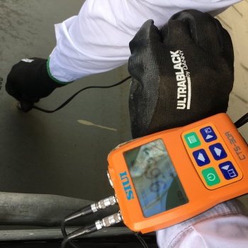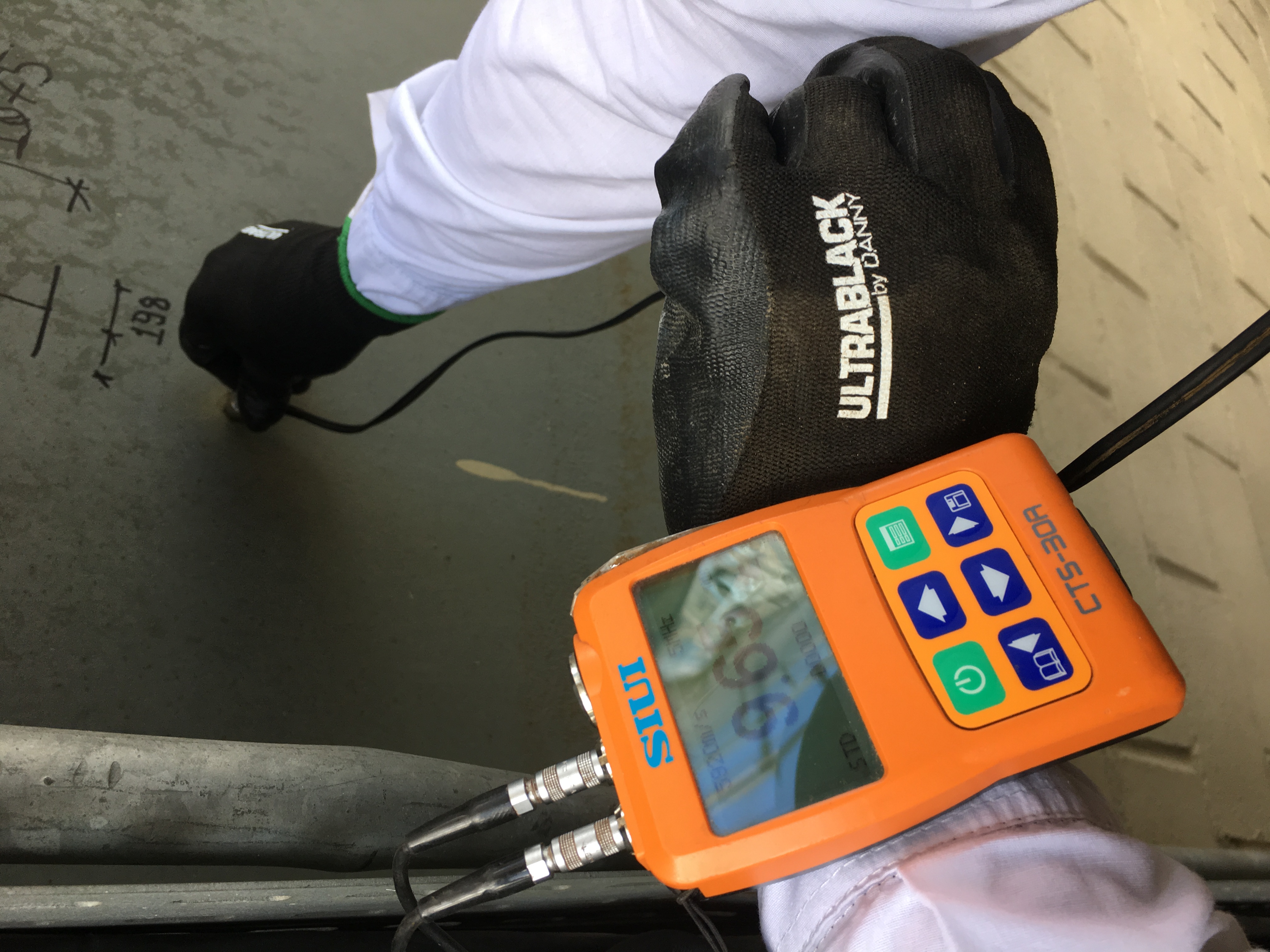 Exame por ultrassom e análise de chapas em fundos de três balsas.